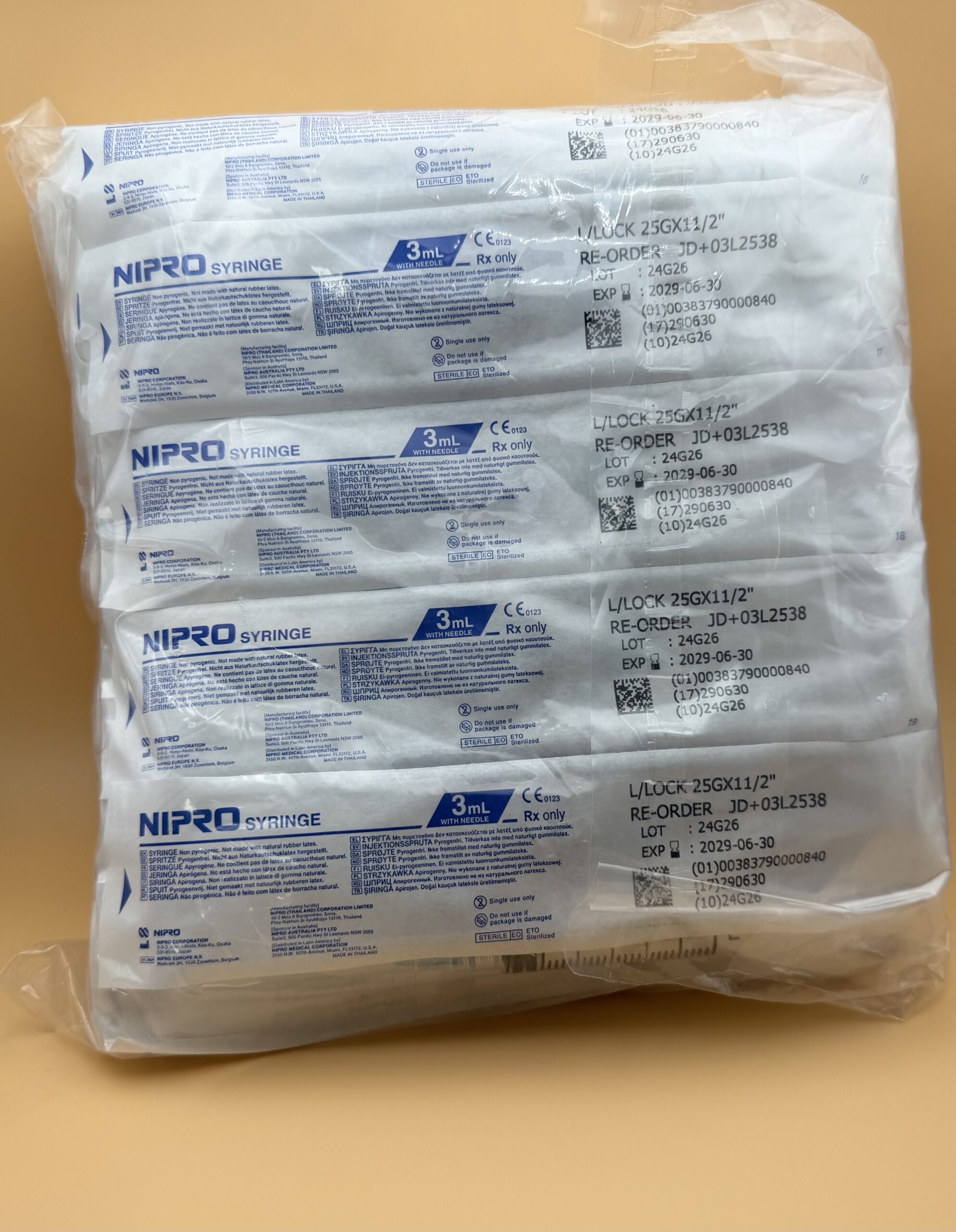 Dispensed as a pack of 50 individually packaged, sterile luer lock syringes with attached hypodermic needles. Hub…